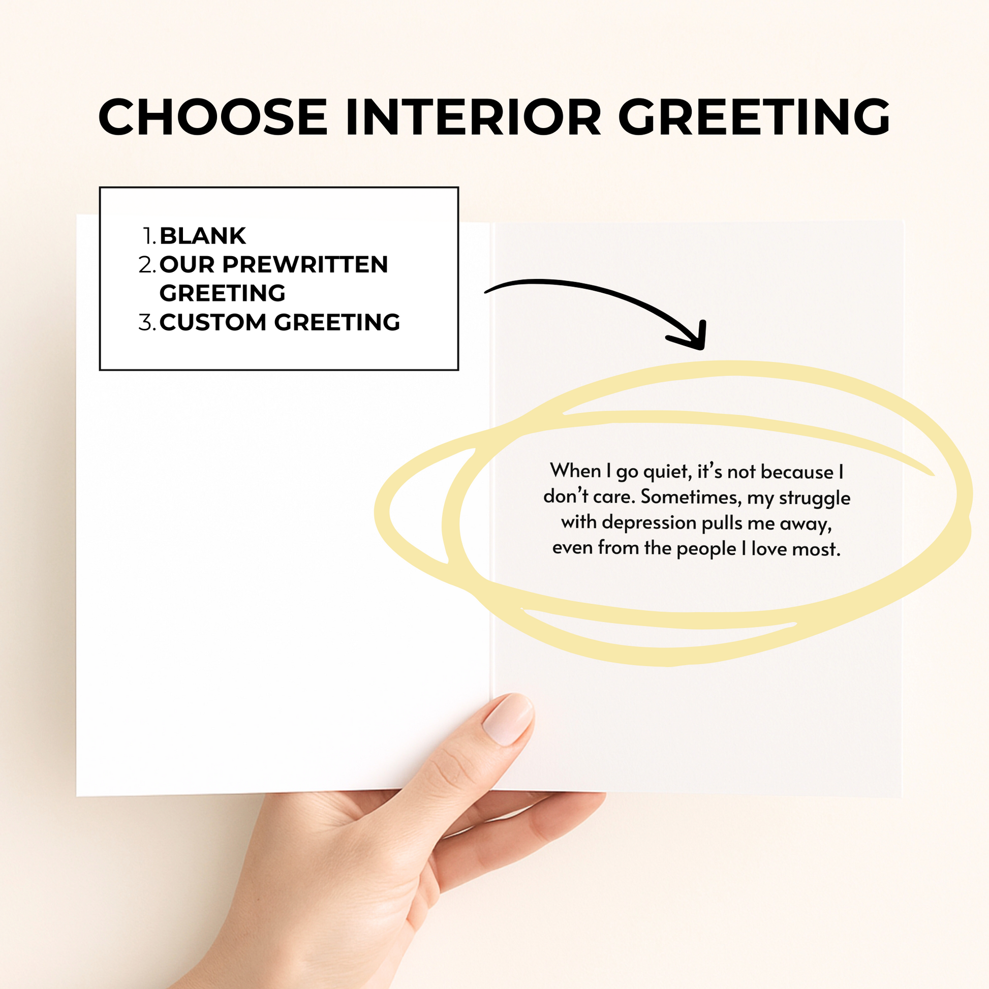This card is designed to gently acknowledge the silence that sometimes accompanies difficult times, like struggles with depression or other personal challenges, while showing appreciation for the patience and understanding of those who matter most.