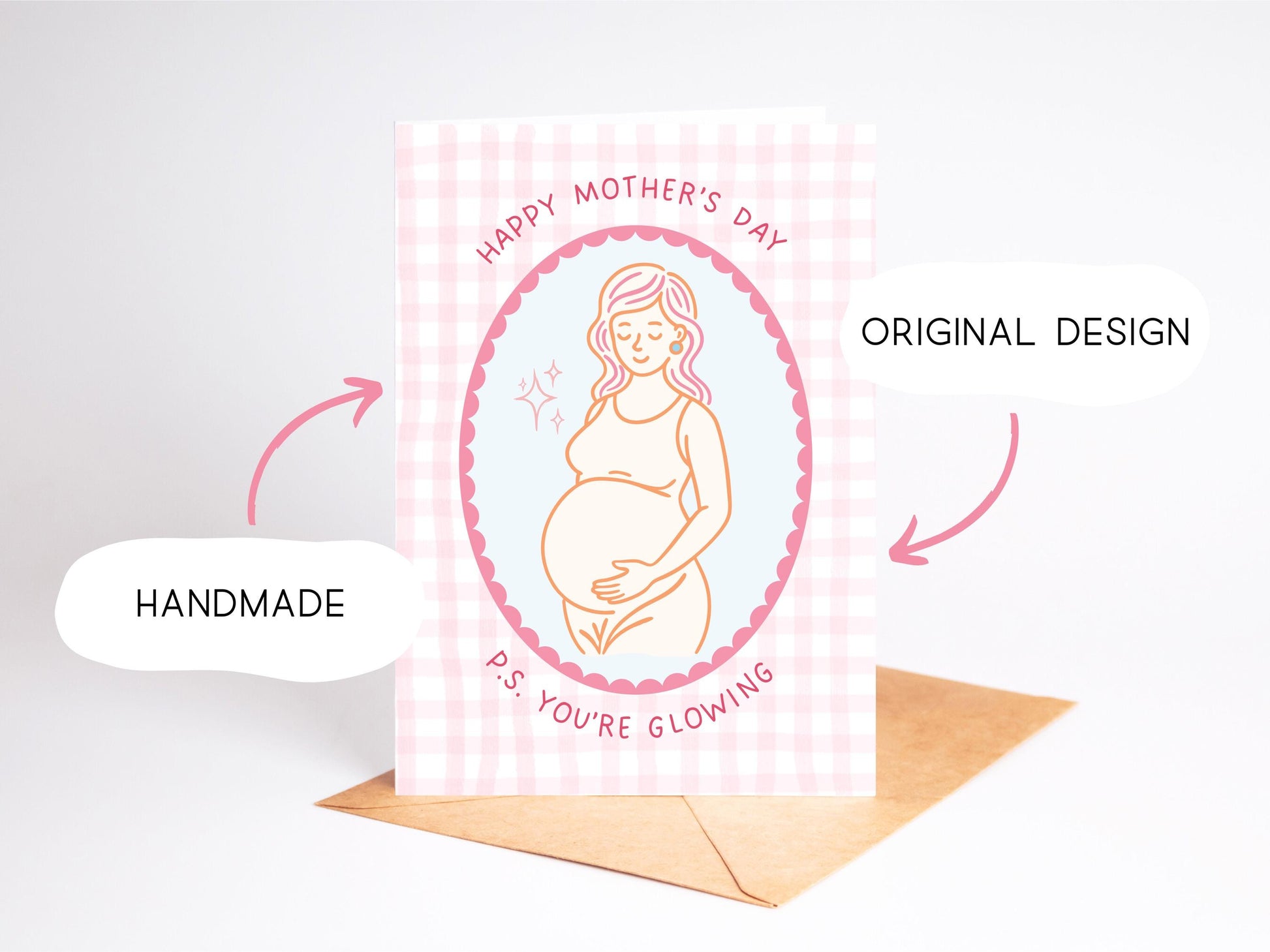 ✨ Celebrate the magic of motherhood in bloom! This handmade Mother’s Day card is designed especially for moms-to-be and features the sweet and stylish message: “Happy Mother’s Day. P.S. You’re Glowing!” It’s paired with soft pastel colors and elegant modern line art of a pregnant woman — a beautiful, affirming way to honor this milestone moment.