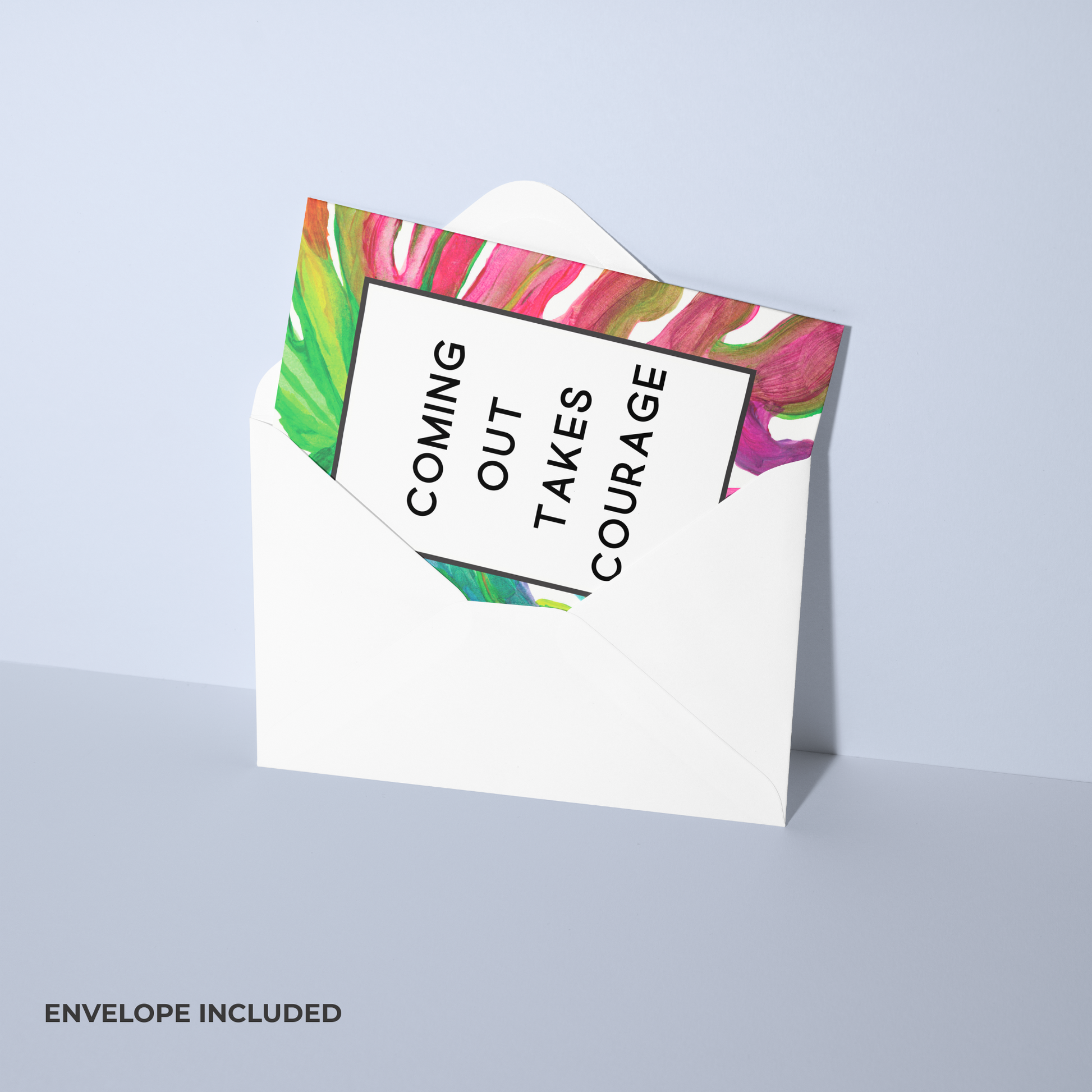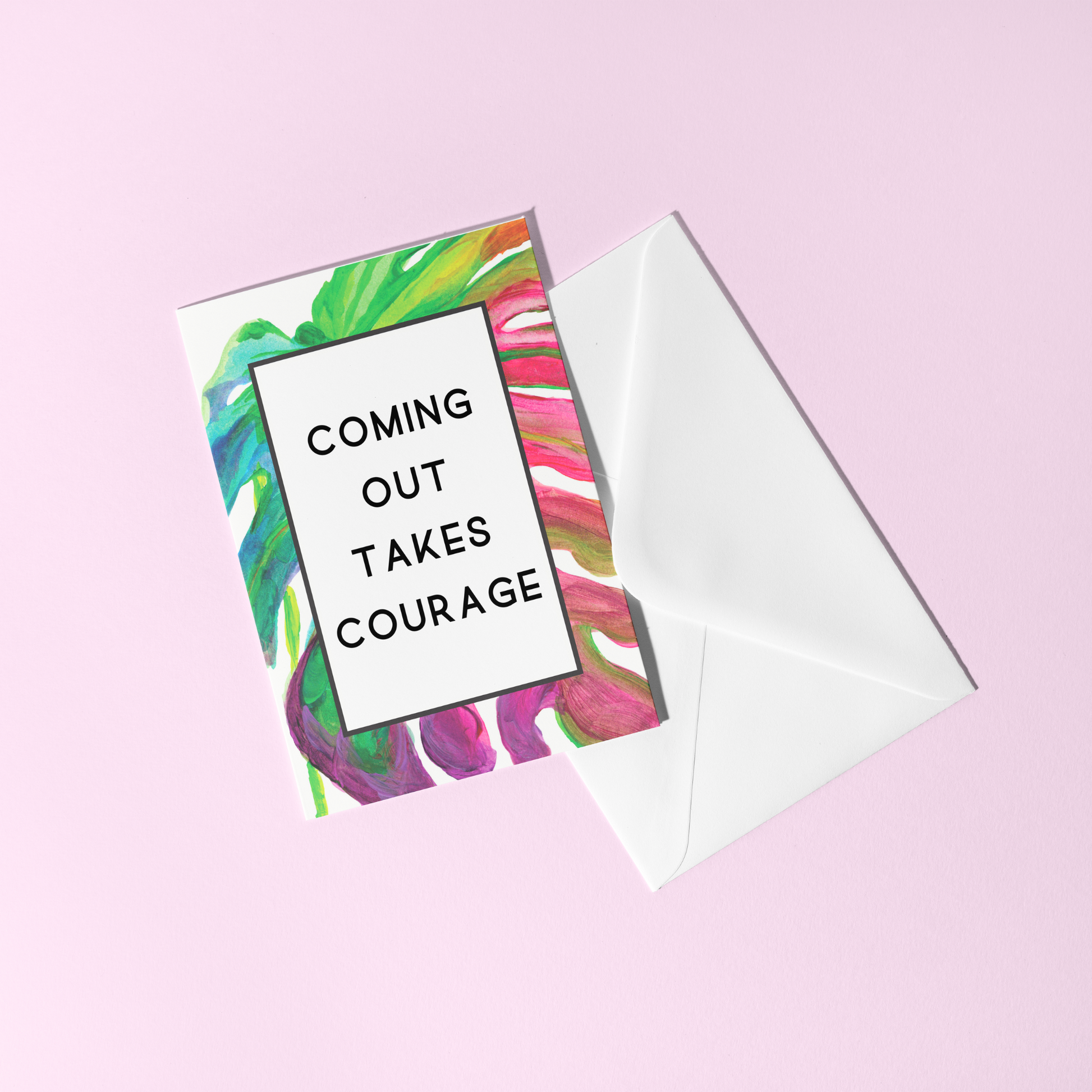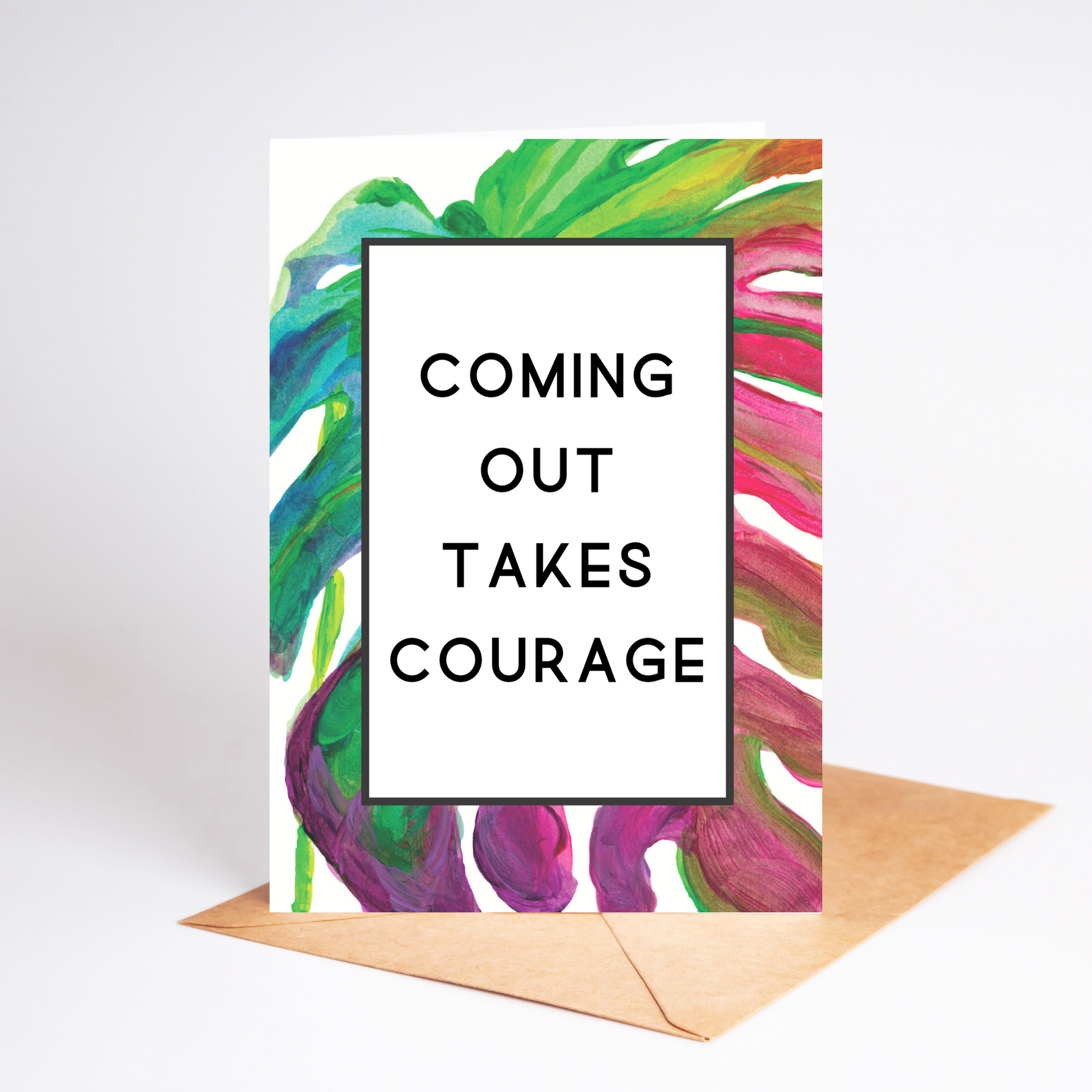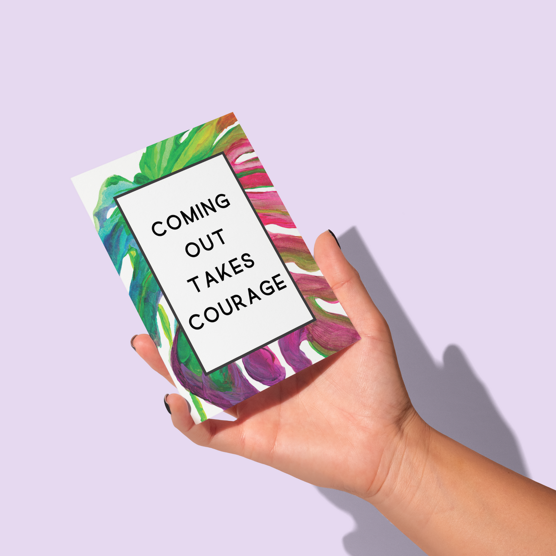 Celebrate and support someone’s bravery with this handmade greeting card featuring a beautiful hand-painted rainbow-colored leaf and the empowering message, "Coming Out Takes Courage."