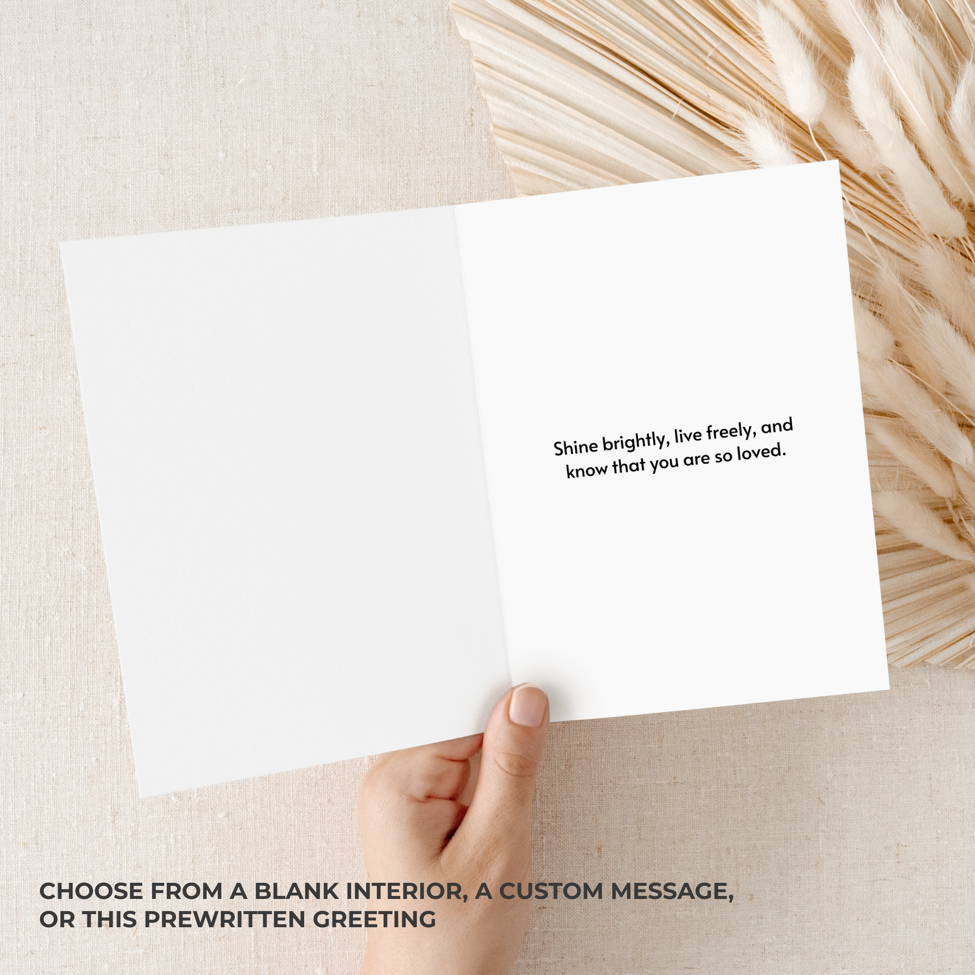 This card acknowledges the strength it takes to live authentically and embrace one’s true self within the LGBTQIA+ community. Thoughtful and heartfelt, it’s perfect for congratulating and uplifting a loved one who has recently come out!