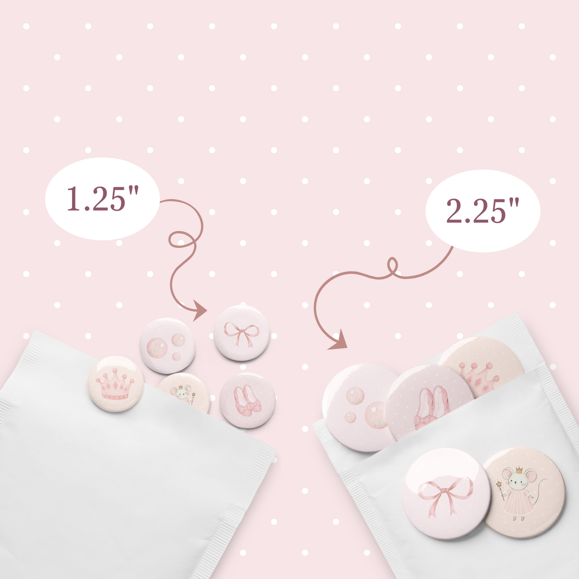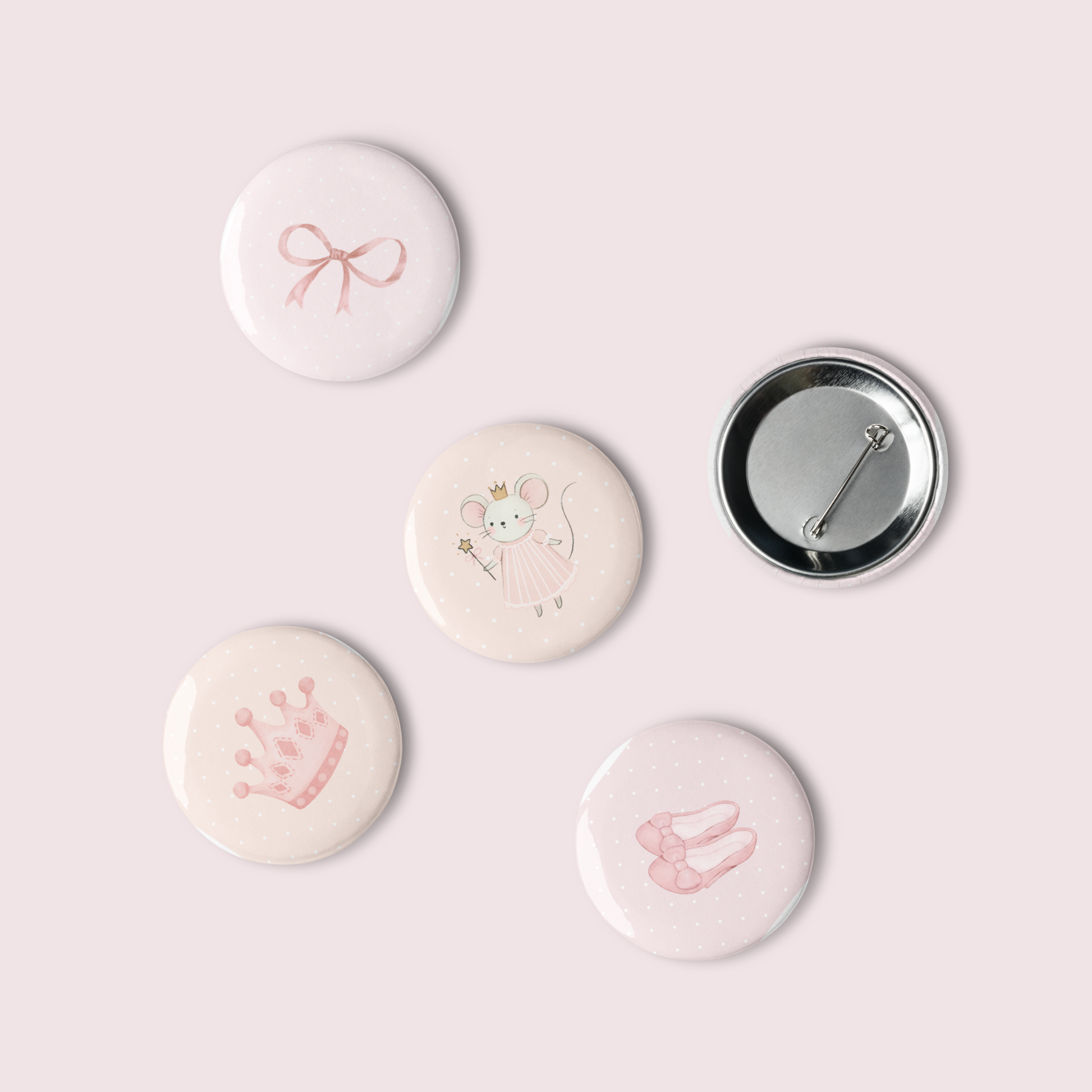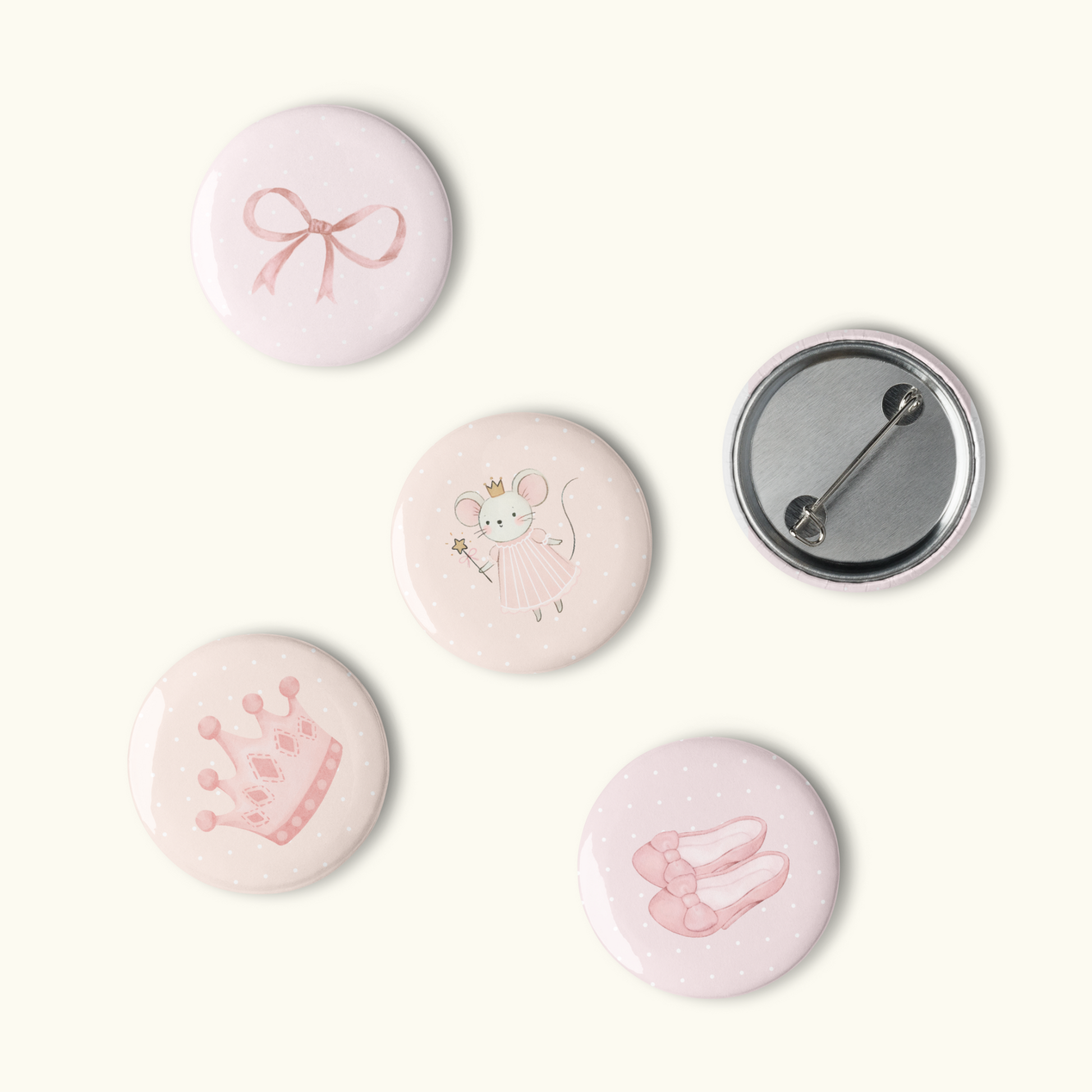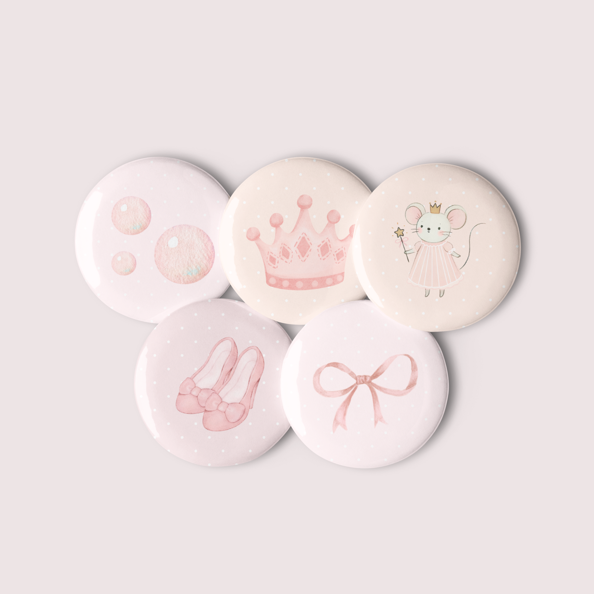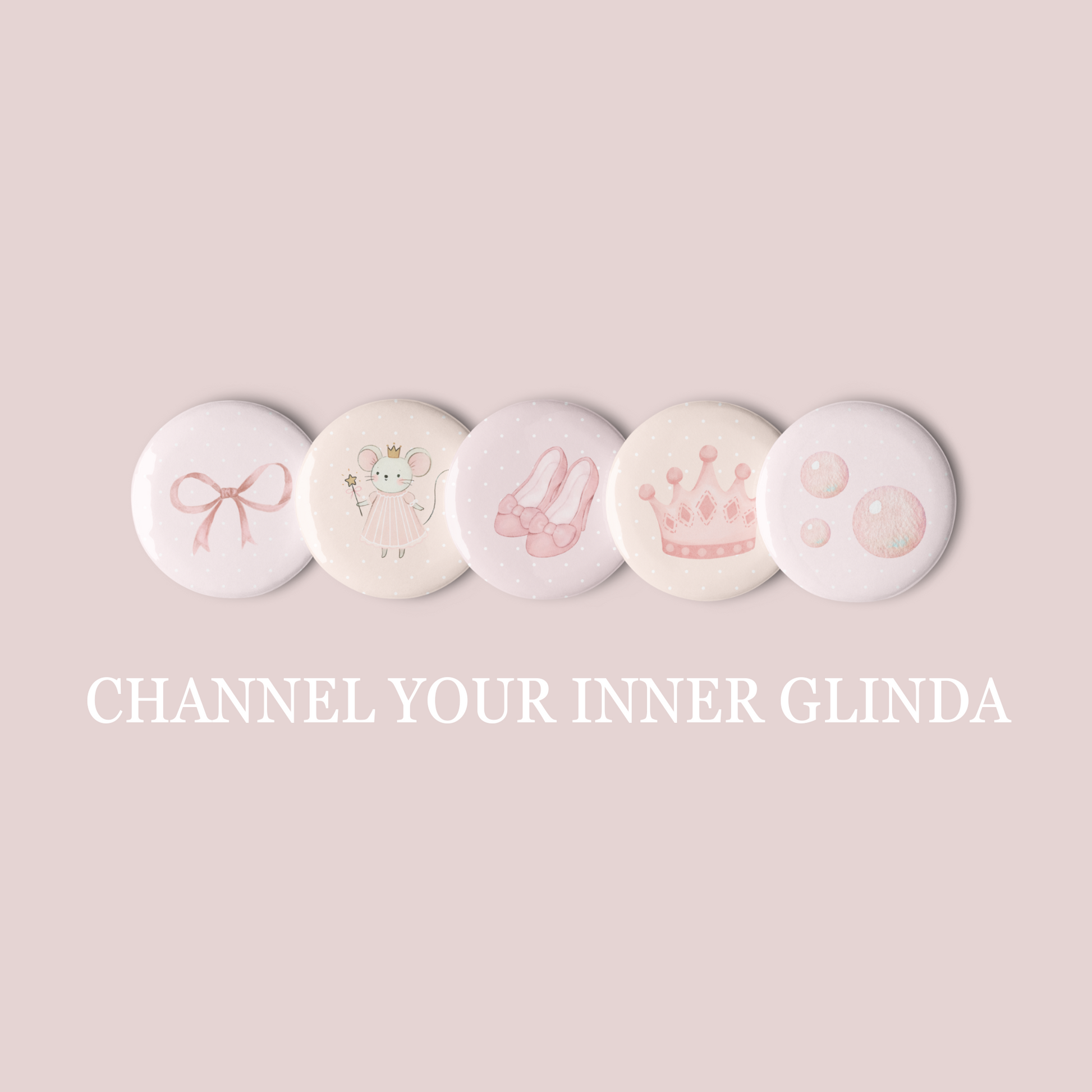 This dreamy set of 5 Glinda-inspired buttons is the perfect pastel accessory pack for any good witch at heart. Featuring original watercolor art inspired by Glinda from the movie Wicked, these buttons sparkle with feminine charm, pink hues, and soft, fairytale magic.