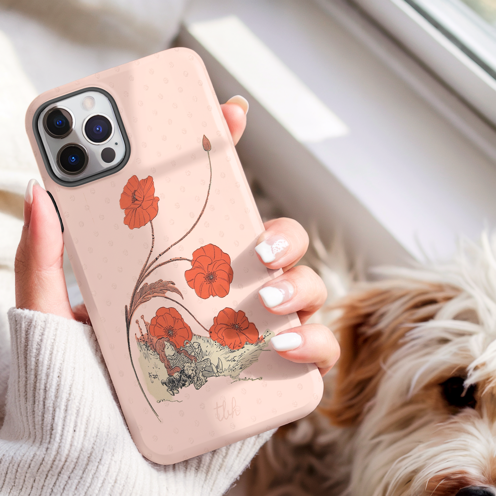 This enchanting tough iPhone case features authentic vintage artwork from the original Wizard of Oz books, capturing a sweet, storybook scene of Dorothy and Toto nestled under a towering, whimsical flower. With its soft pastel tones and delicate lines, this design feels like a fairytale you can carry in your hand.