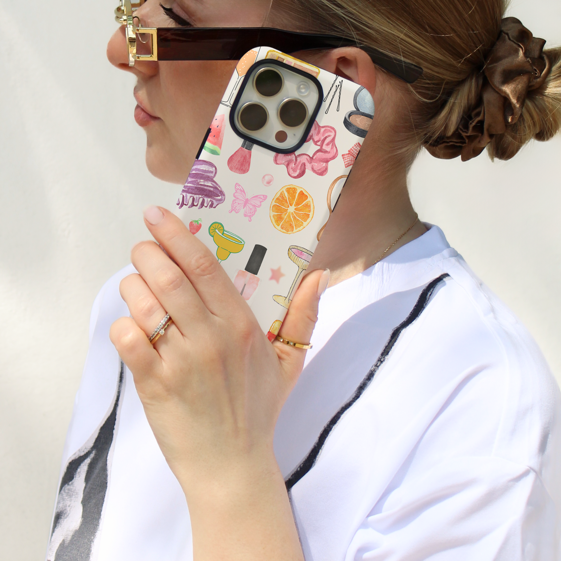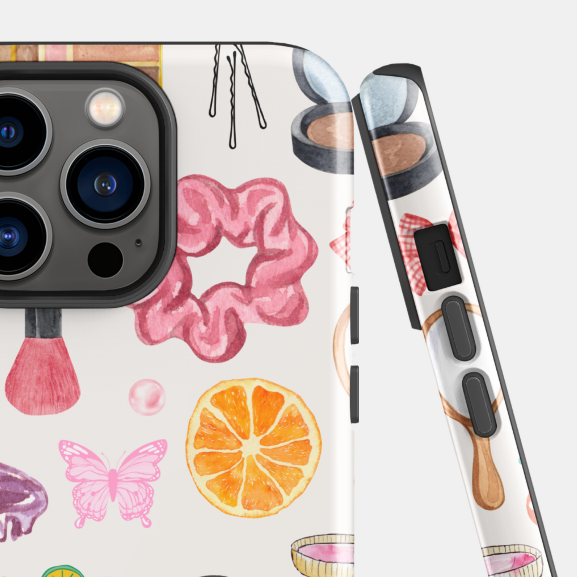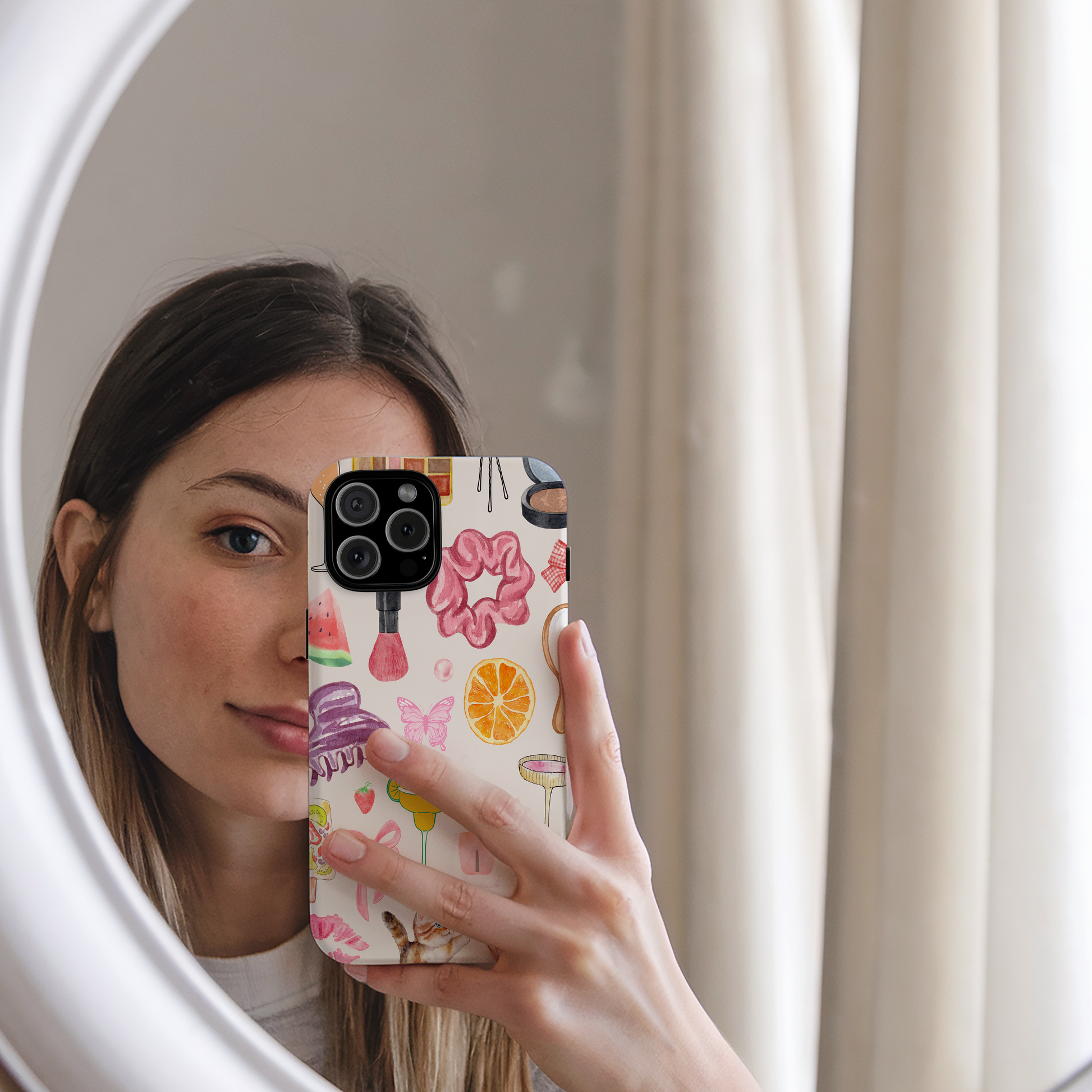 This tough iPhone case features a vibrant, watercolor-style collage of all things girlhood and glam โ from scrunchies and nail polish to bright pink cocktails, lip glosses, and everything in between. Itโs a celebration of feminine energy in its loudest, cutest, most confident form.