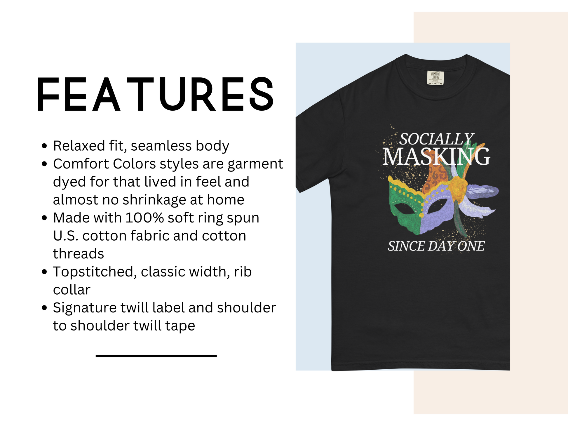 Celebrate neurodivergence with humor, style, and relatability in this unique Comfort Colors 1717 t-shirt. Featuring a hand-painted Mardi Gras mask design and the phrase "Socially Masking Since Day One," this shirt speaks to the experience of socially masking while embracing authenticity. Itās the perfect mix of cute, funny, and destigmatizingāa must-have for those who love meaningful and relatable apparel.