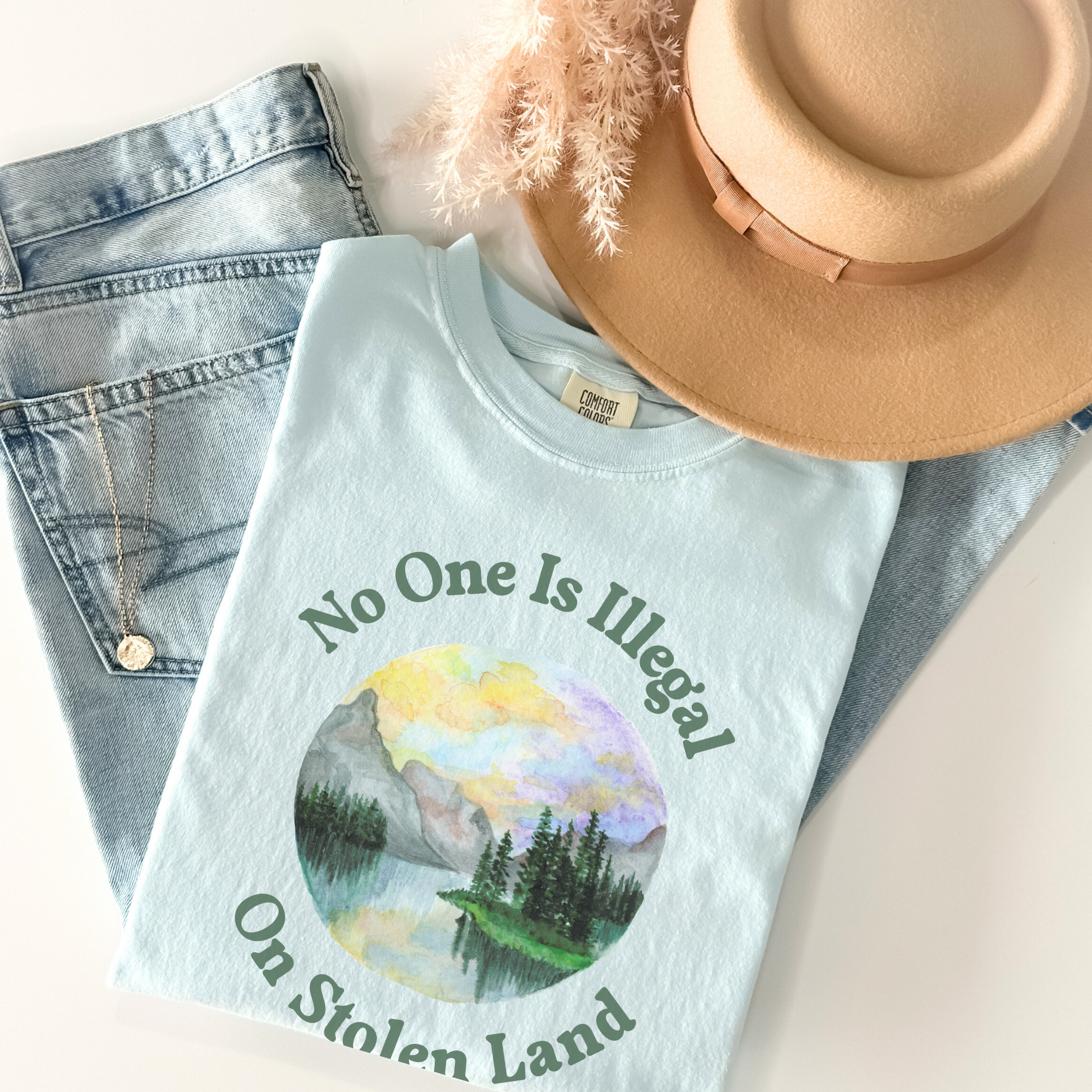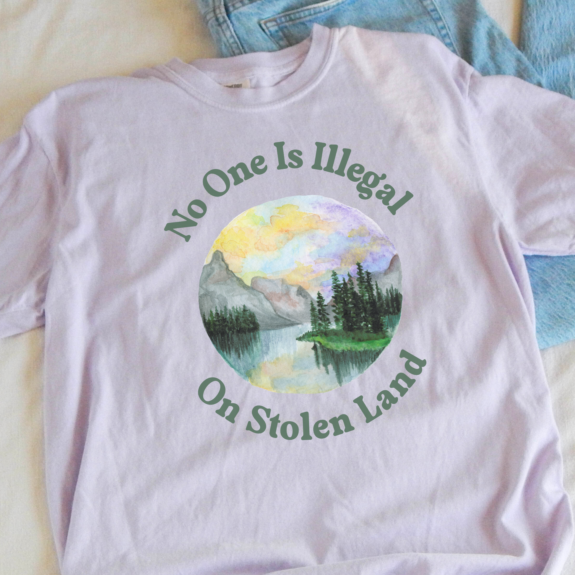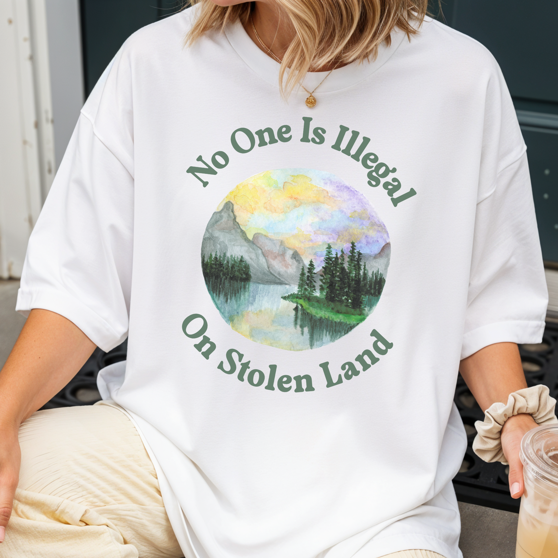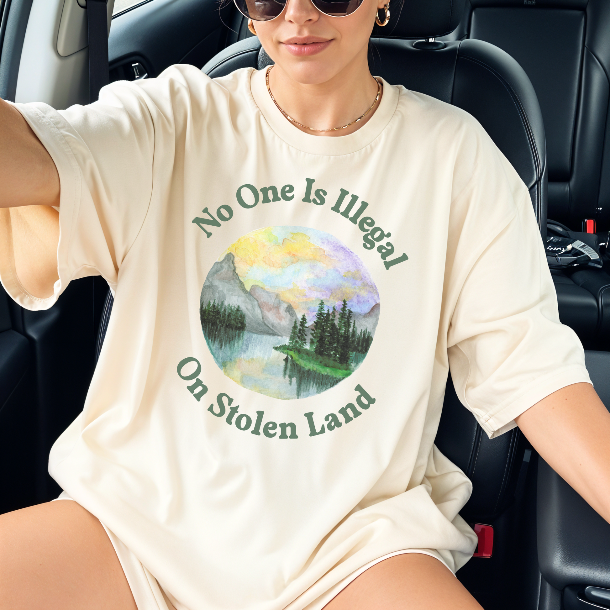 Set against a vibrant hand-painted-style landscape, the design speaks to both immigrant rights and Indigenous solidarity, offering a statement that’s as artistic as it is unapologetic. It’s the perfect blend of activism and art, made for people who believe borders shouldn't define belonging.