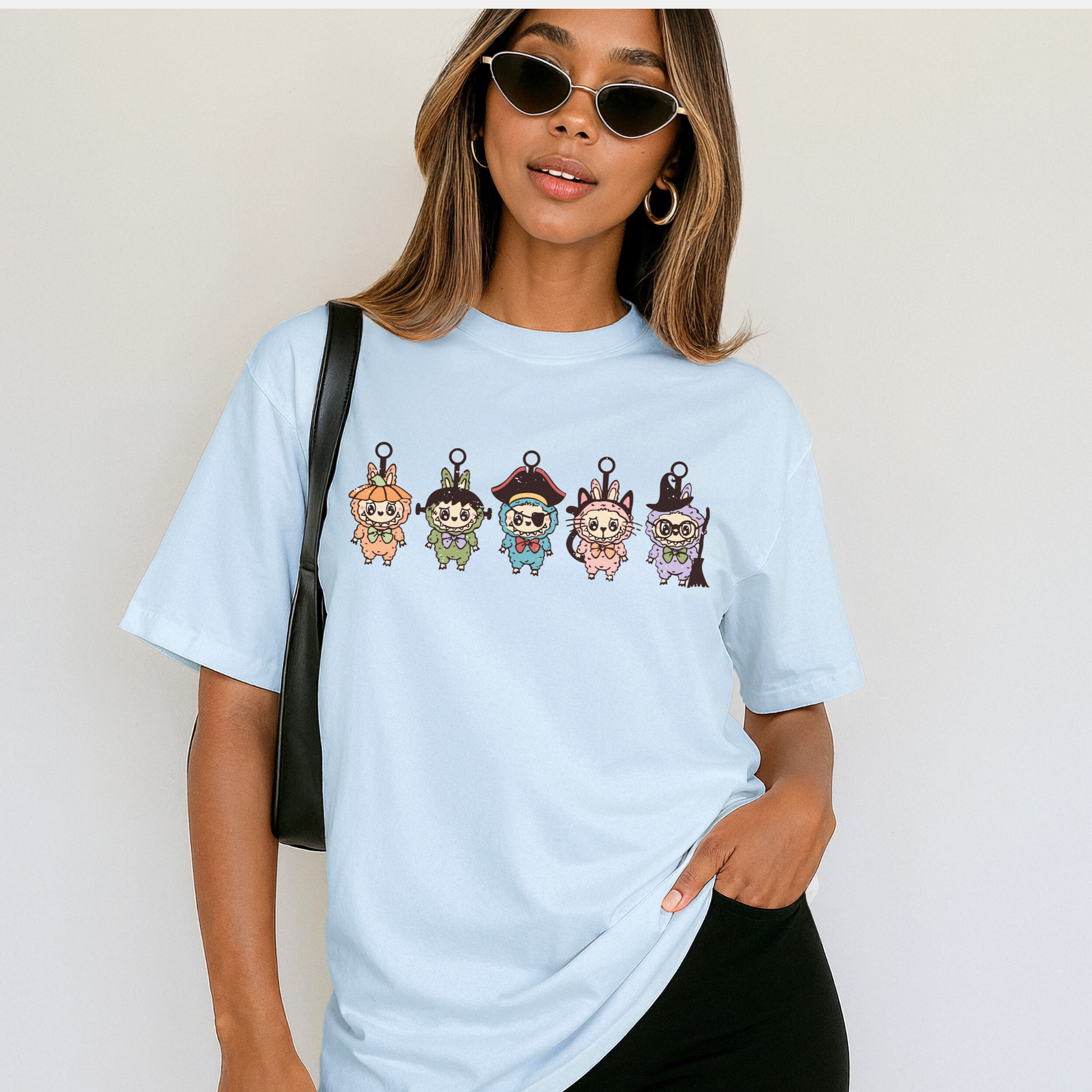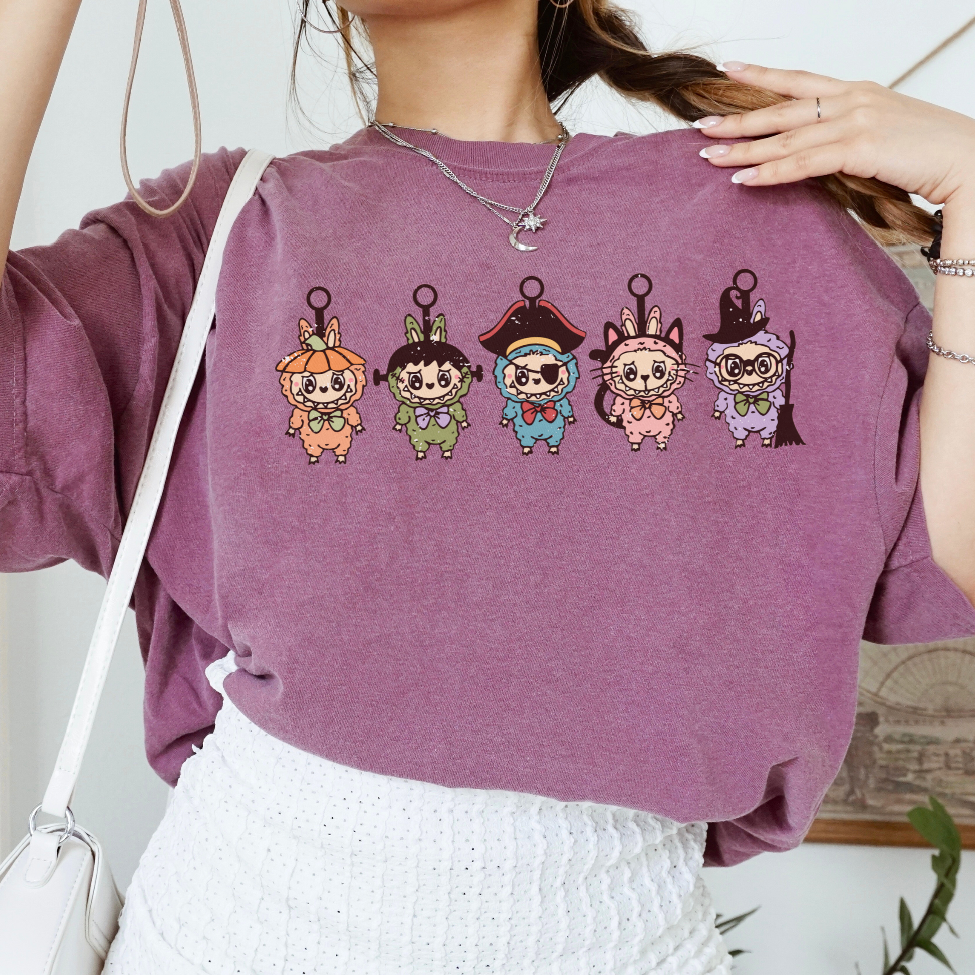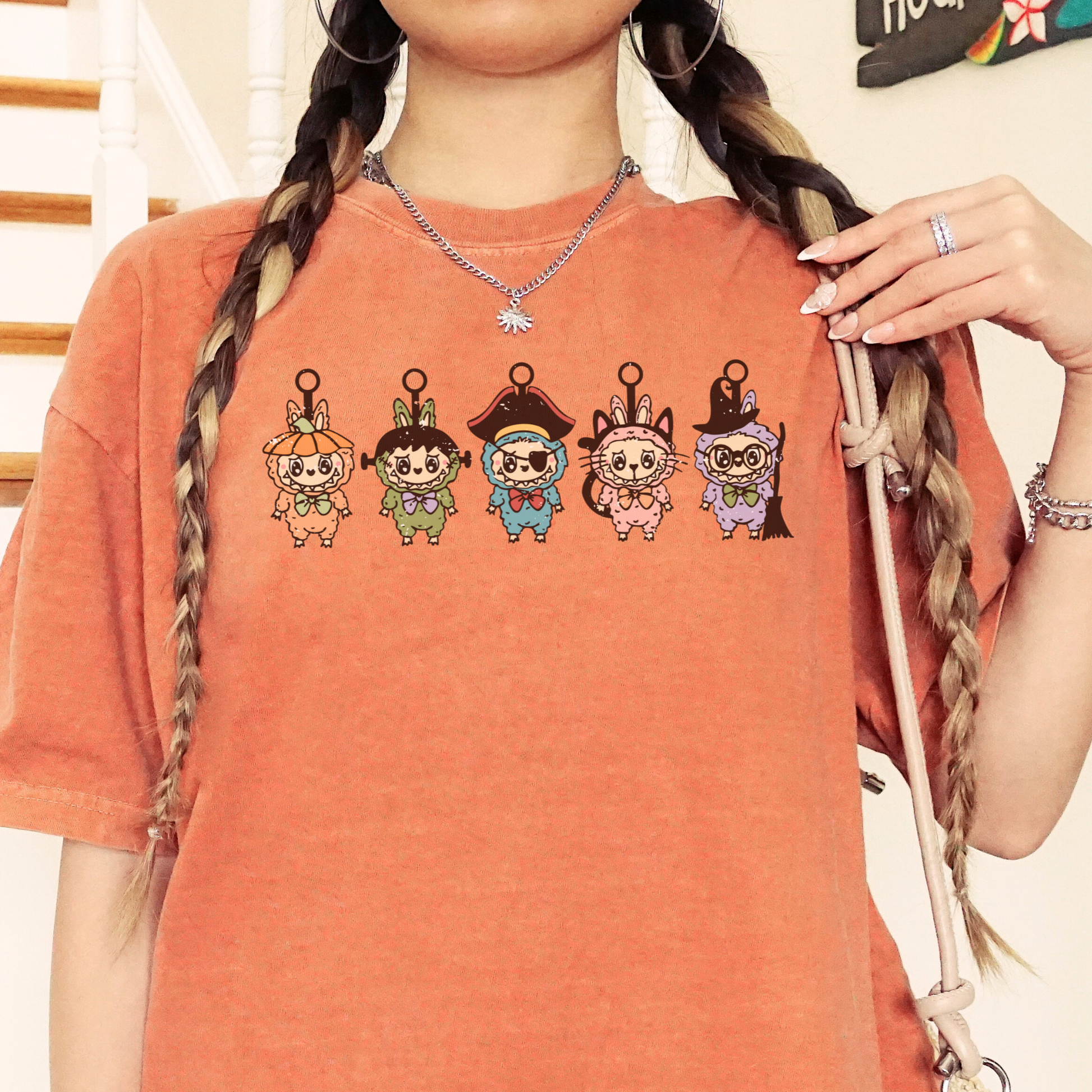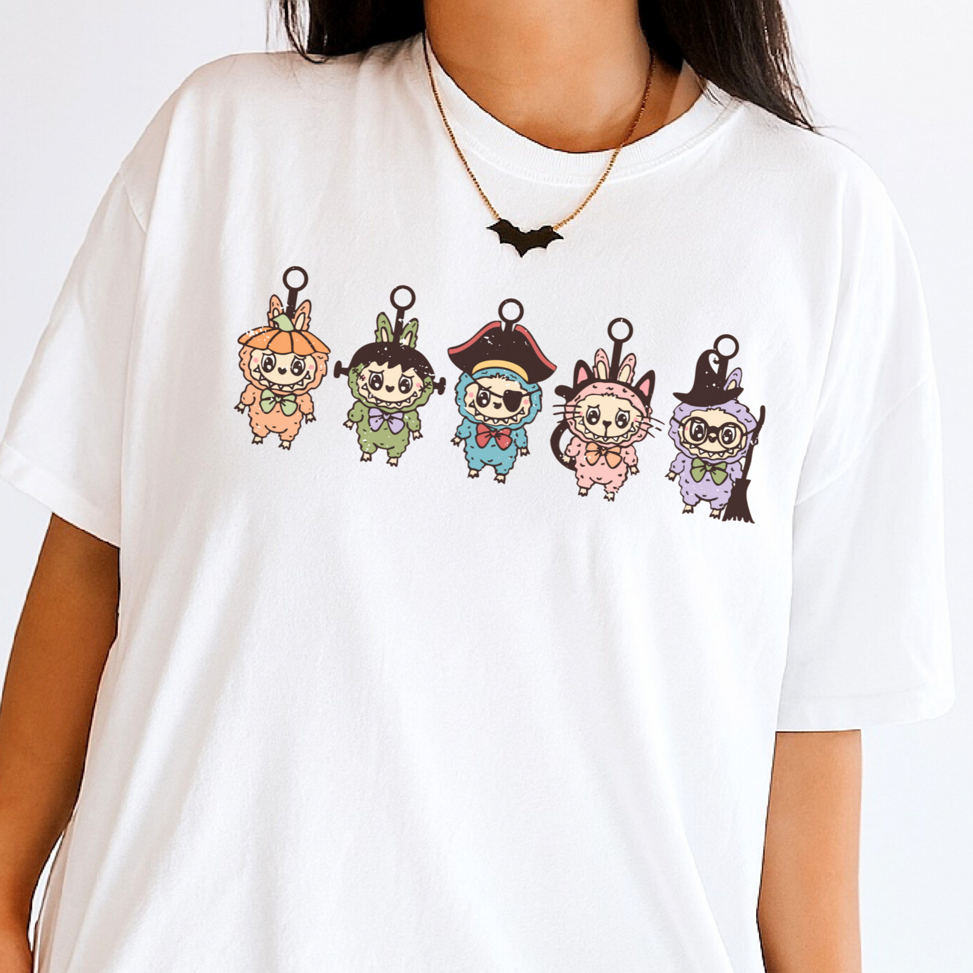 Celebrate spooky season with a playful twist! This Halloween t-shirt features 5 adorable Labubus dressed in festive costumes!