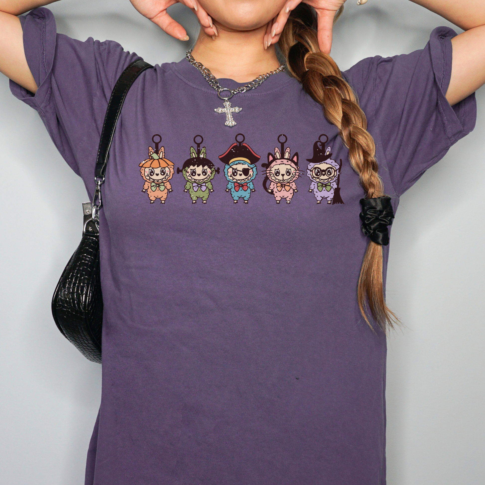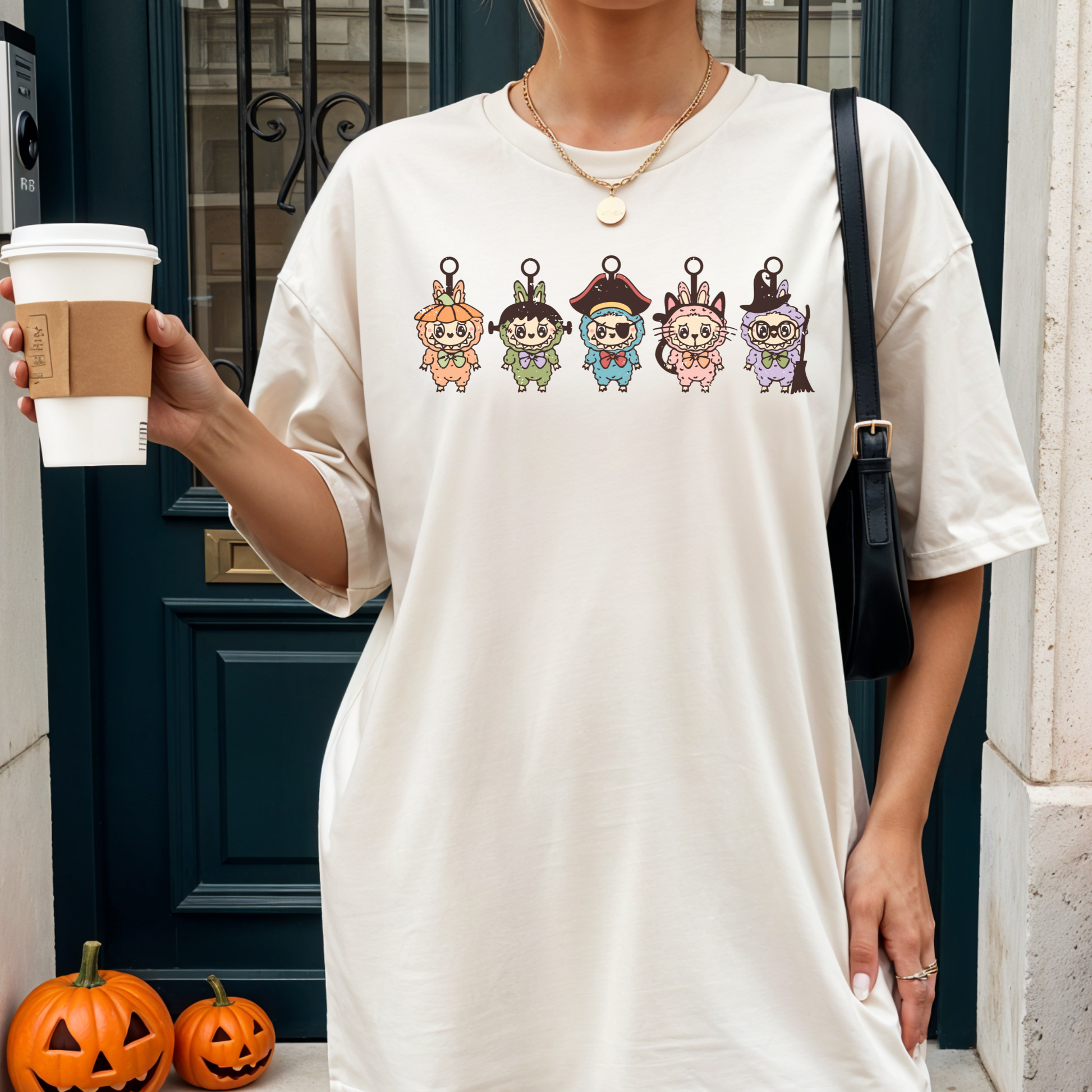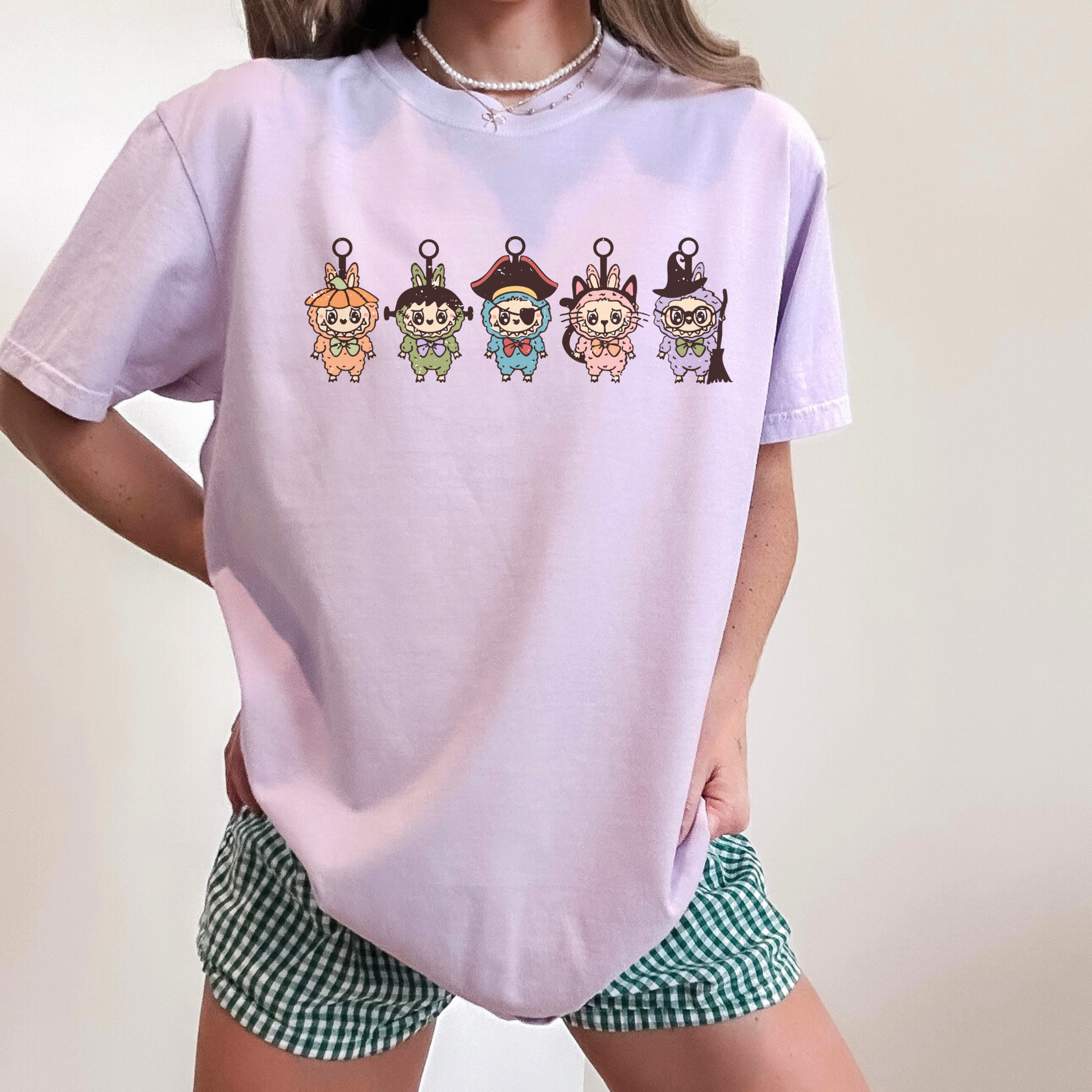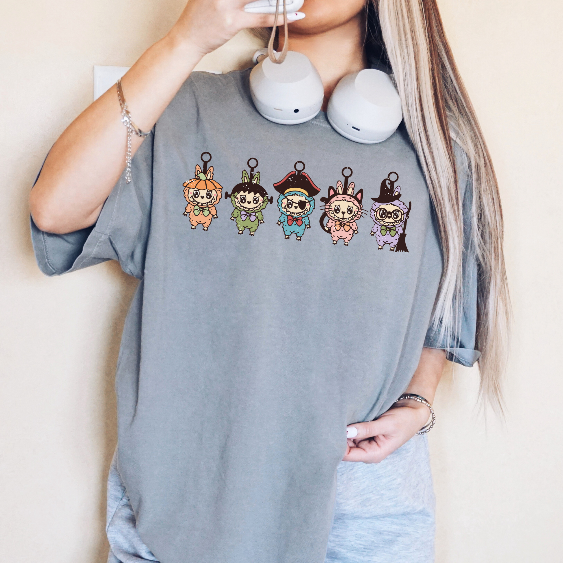 Celebrate spooky season with a playful twist! This Halloween t-shirt features 5 adorable Labubus dressed in festive costumes!