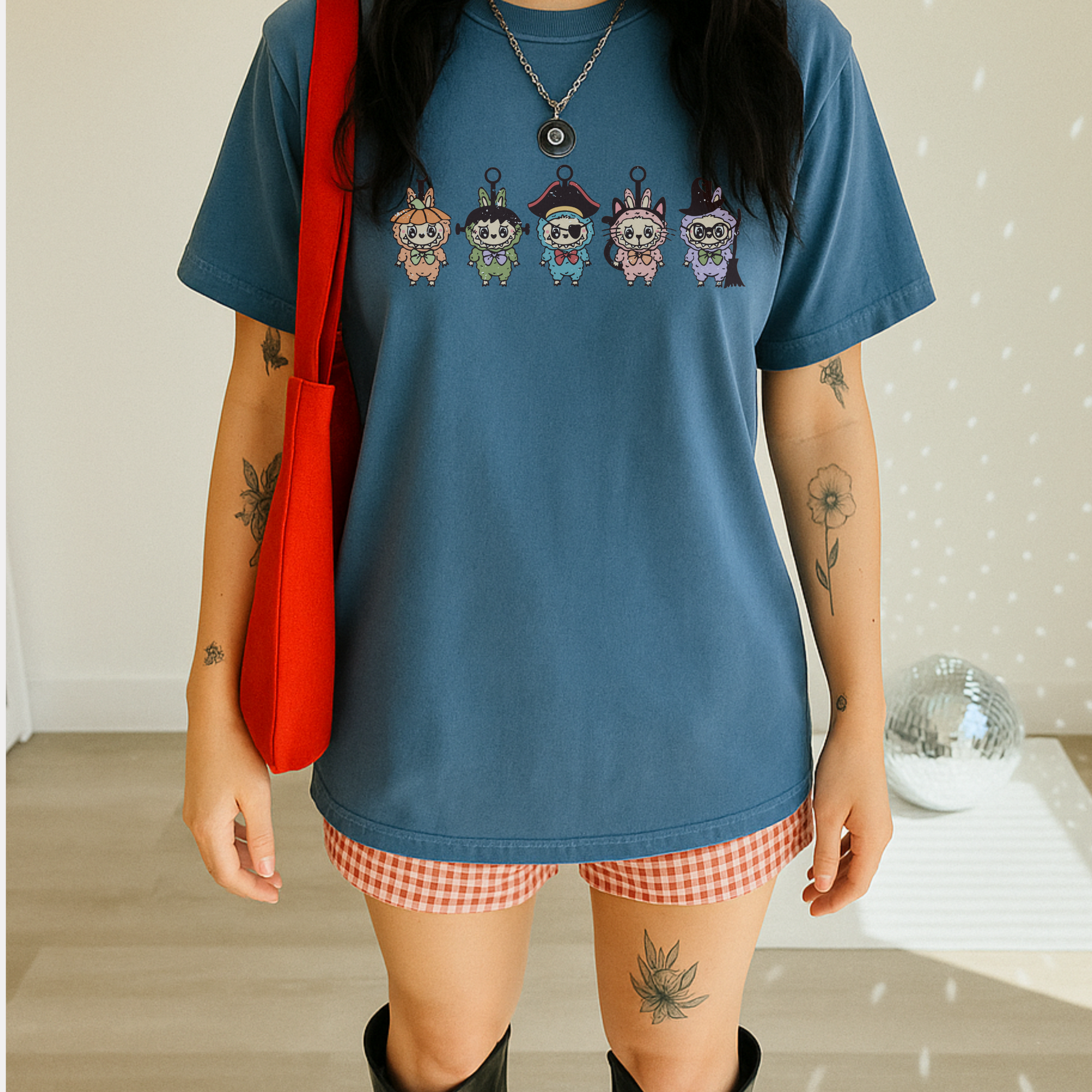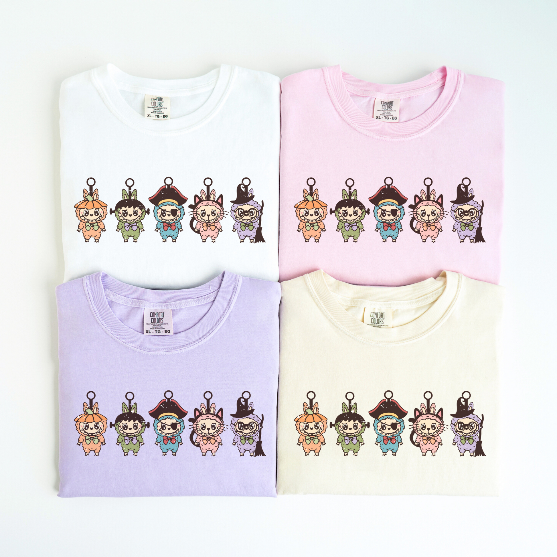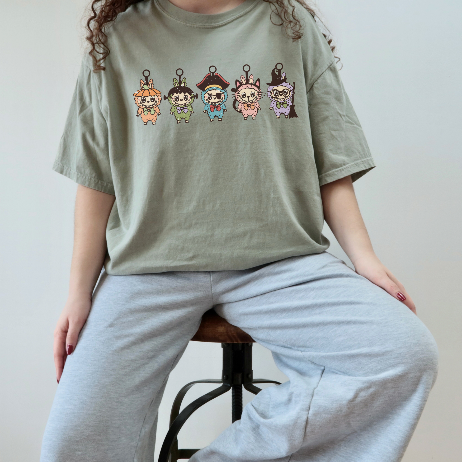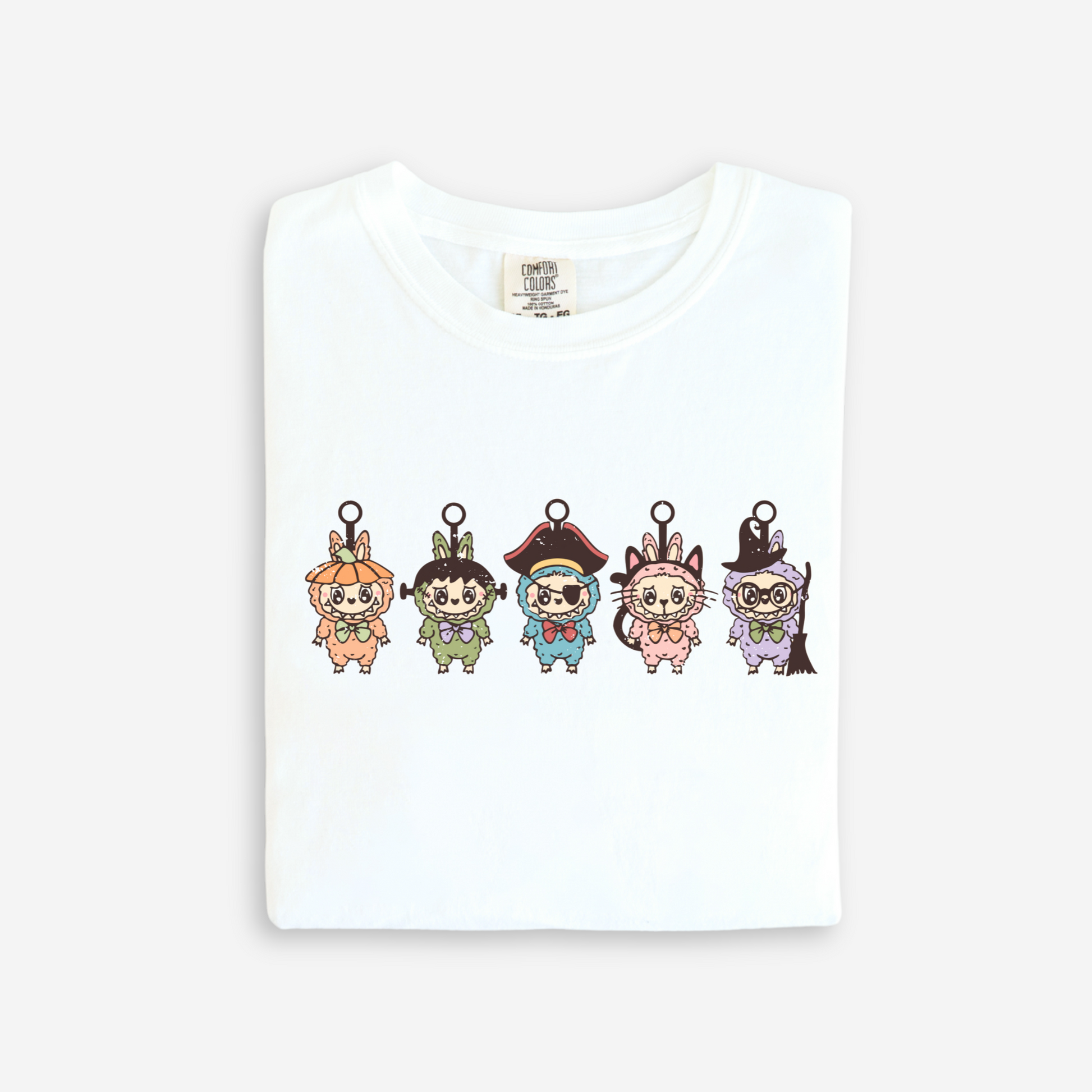 Celebrate spooky season with a playful twist! This Halloween t-shirt features 5 adorable Labubus dressed in festive costumes!