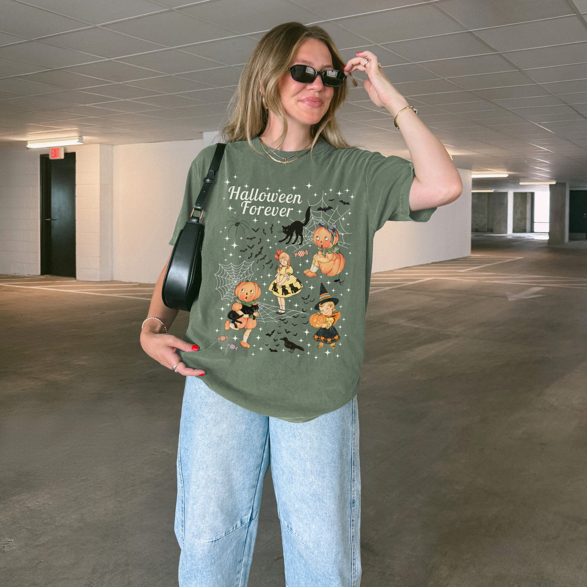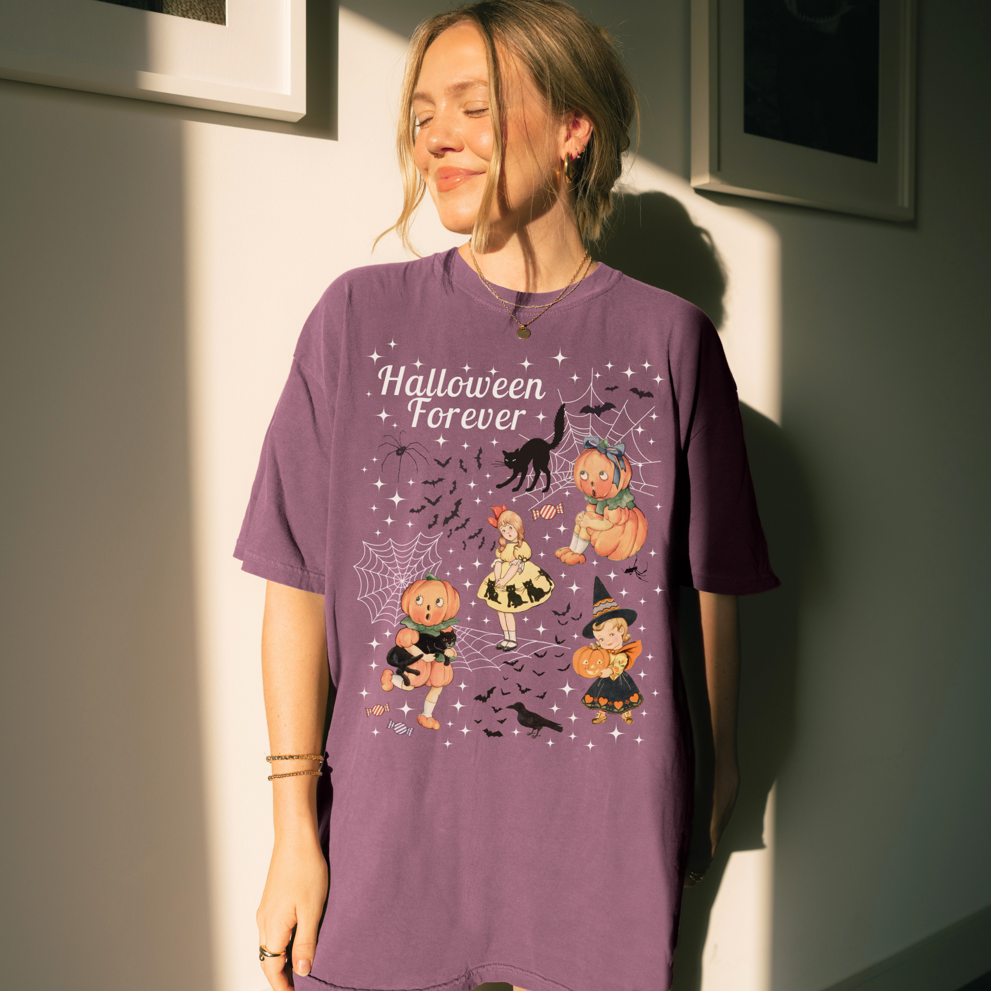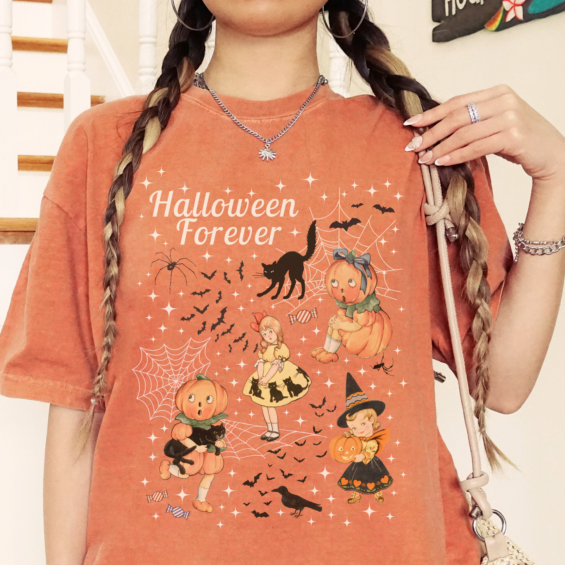 🎃 Celebrate spooky season all year long with our "Halloween Forever" T-shirt, featuring a charming collage of authentic vintage Halloween illustrations!