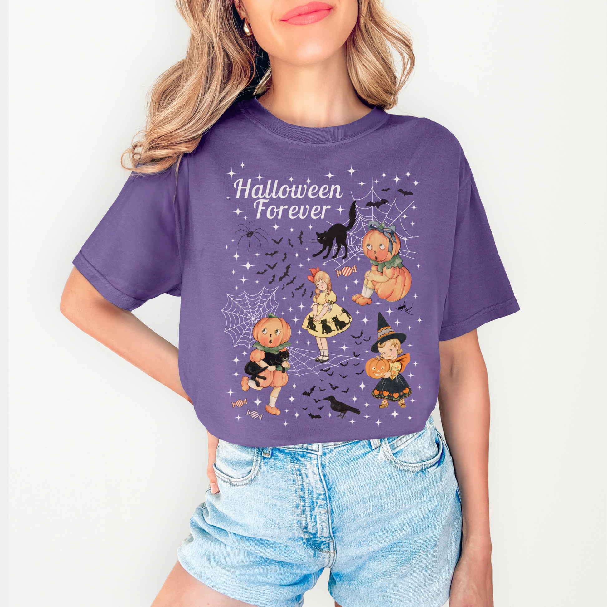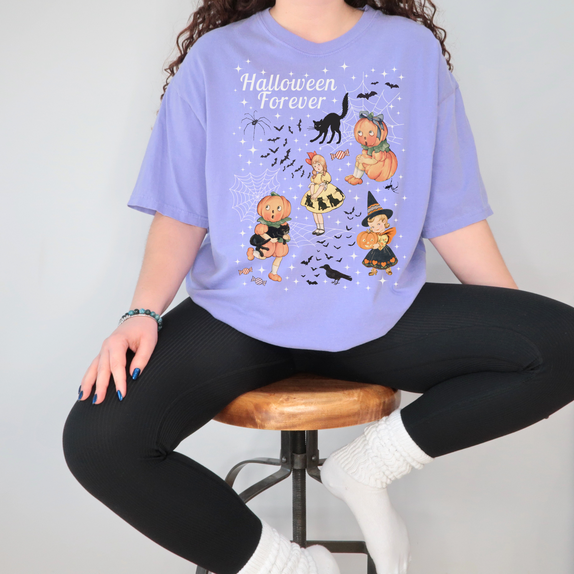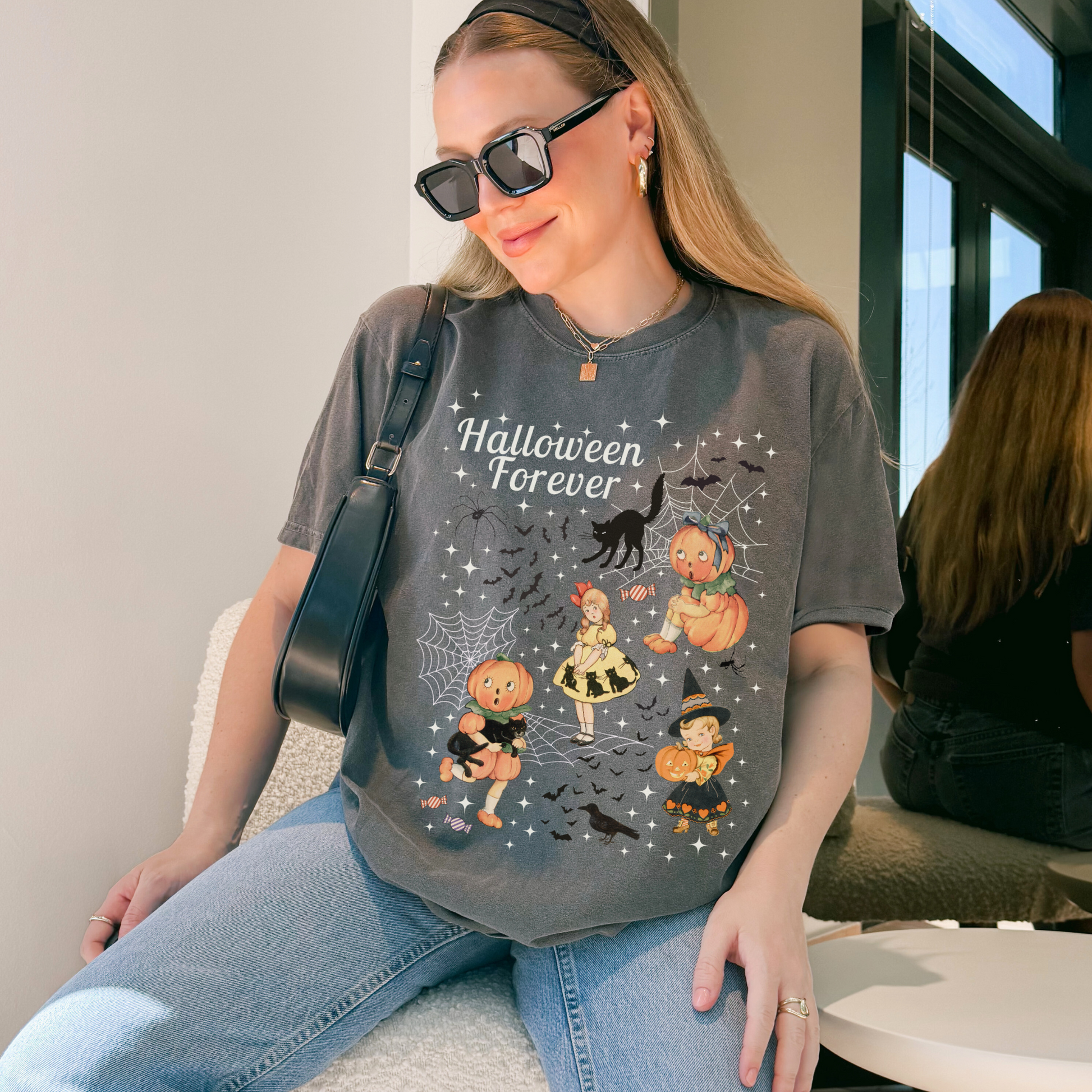 🎃 Celebrate spooky season all year long with our "Halloween Forever" T-shirt, featuring a charming collage of authentic vintage Halloween illustrations!
