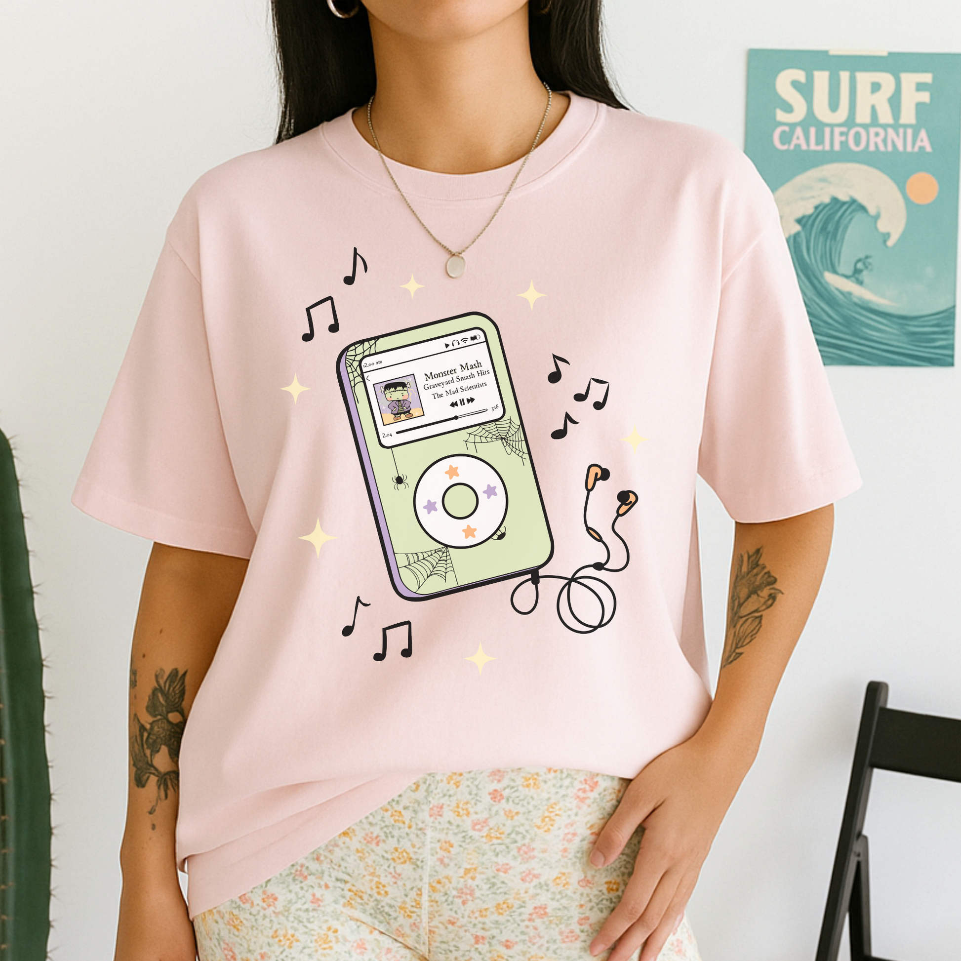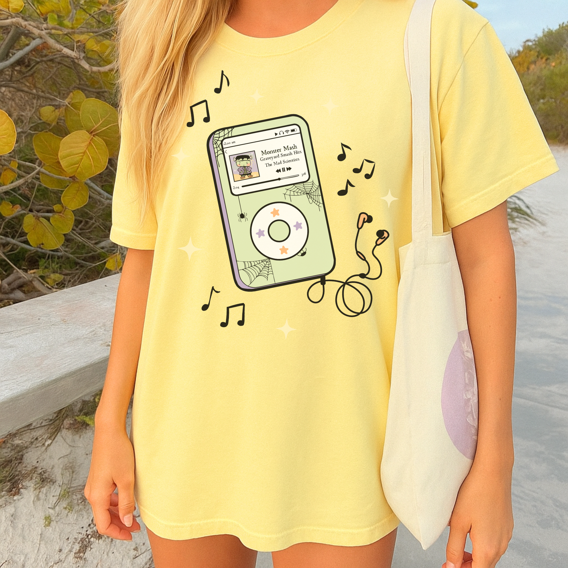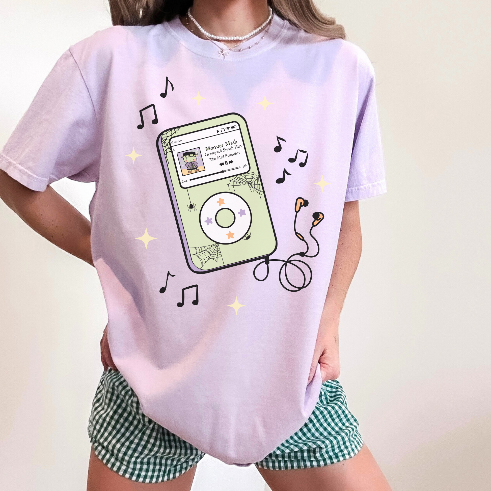 Featuring original, hand-drawn artwork of a pastel Y2K-style iPod playing “Monster Mash”, this design shows a cute Frankenstein album cover surrounded by cobwebs, earbuds, and floating music notes.