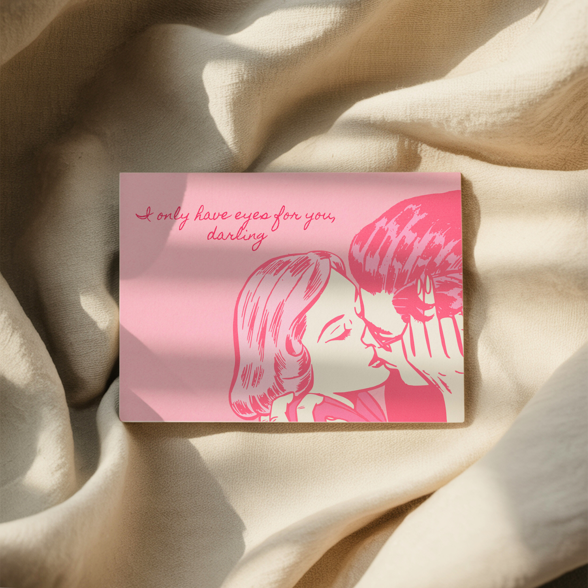 A love letter in card form! This handmade Valentine’s Day greeting card is the perfect way to express your affection to your special someone. Featuring a charming vintage-inspired design of a couple kissing and soft pink tones, this romantic card brings timeless elegance with a touch of nostalgia.